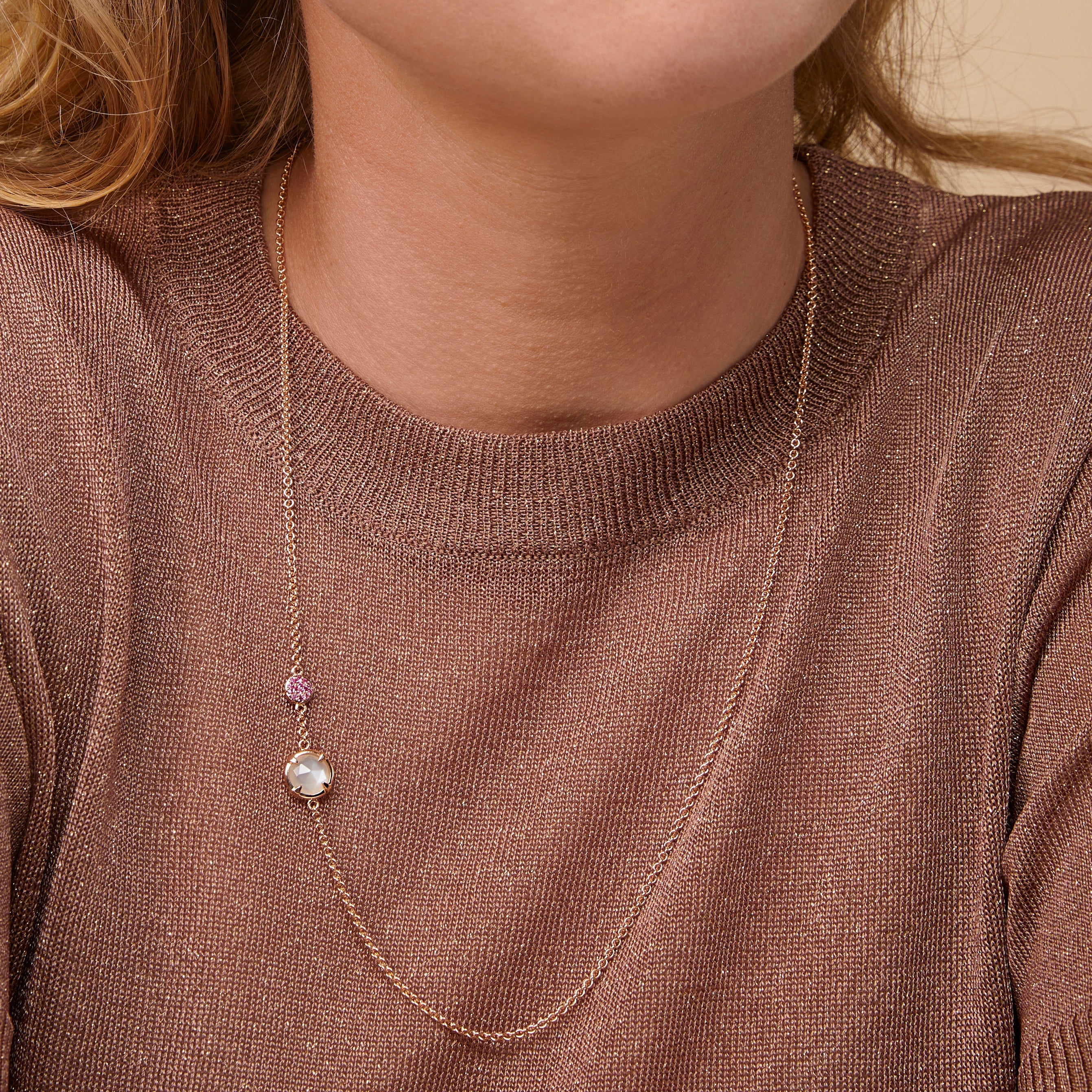 Mira Mira necklace with white moonstone and a Stardust element of white diamonds and hot pink sapphires.