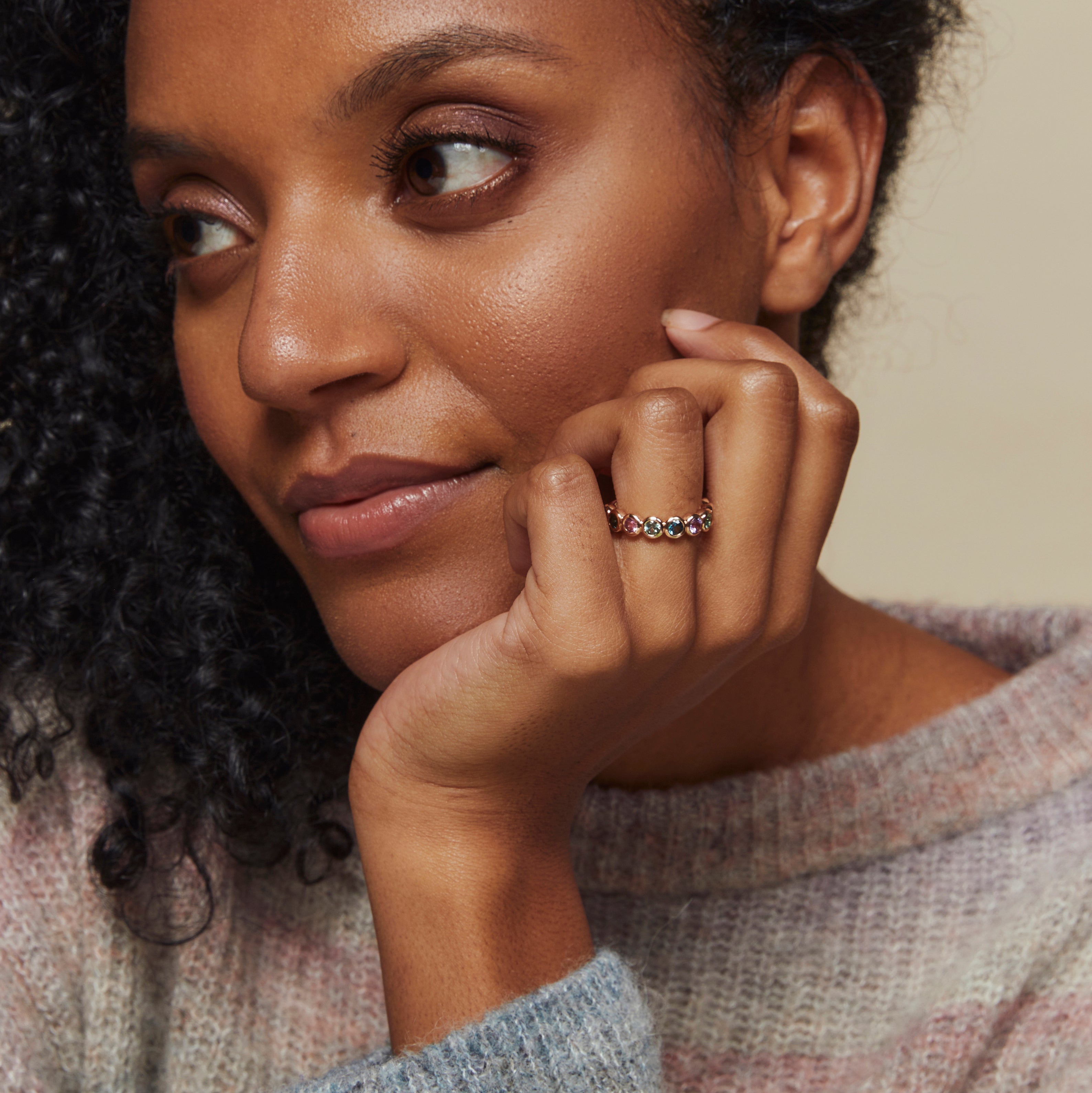 The sapphire shades of the new Confetti ring beautifully complement our tourmaline tones. This is the medium-sized version.