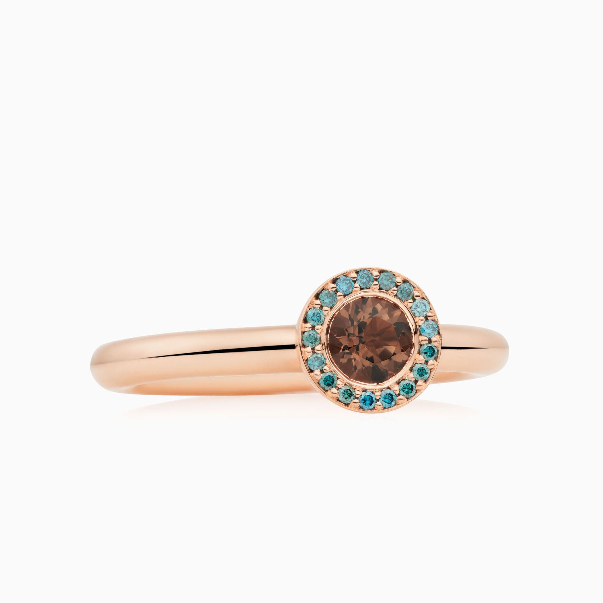 A vibrant, facetted smokey quartz wrapped in a thick golden bezel. Set with blue diamonds.