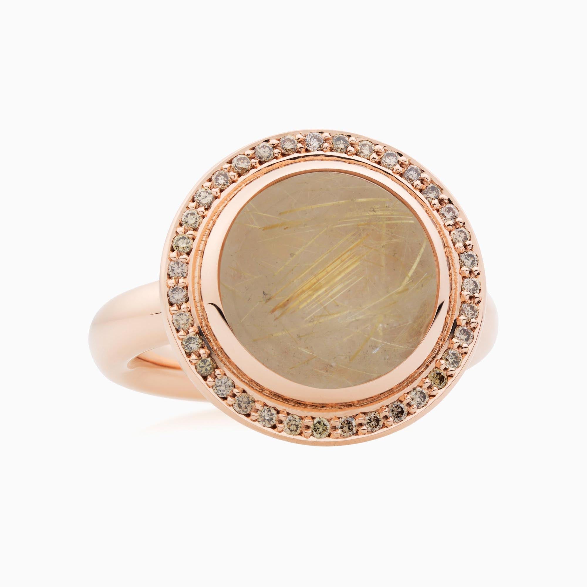 A cabochon rutile quartz surrounded by a sugar ring of champagne diamonds. A highly unusual ring.